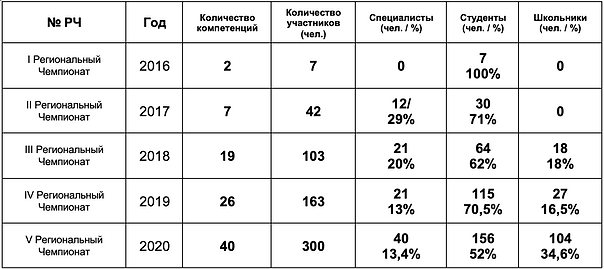 С 2018 года в региональных чемпионатах принимают участие все три категории участников: школьники, студенты и специалисты.